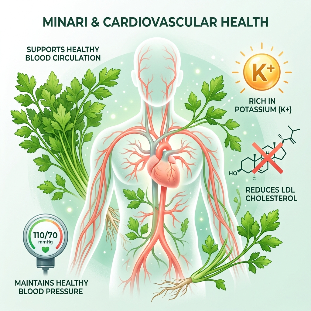 미나리는 혈액을 맑게 하고 혈중 콜레스테롤 수치를 낮춰주는 효과가 있어 동맥경화 예방에 효과적입니다.