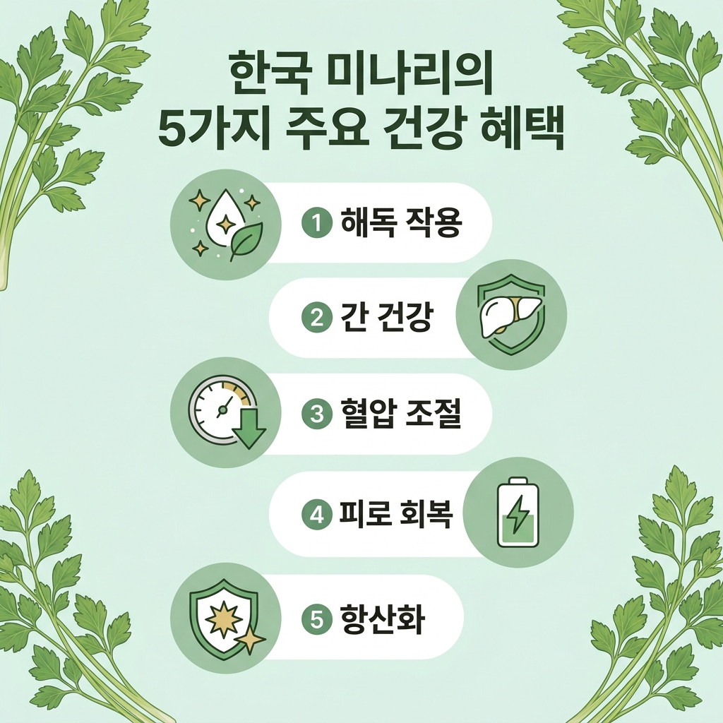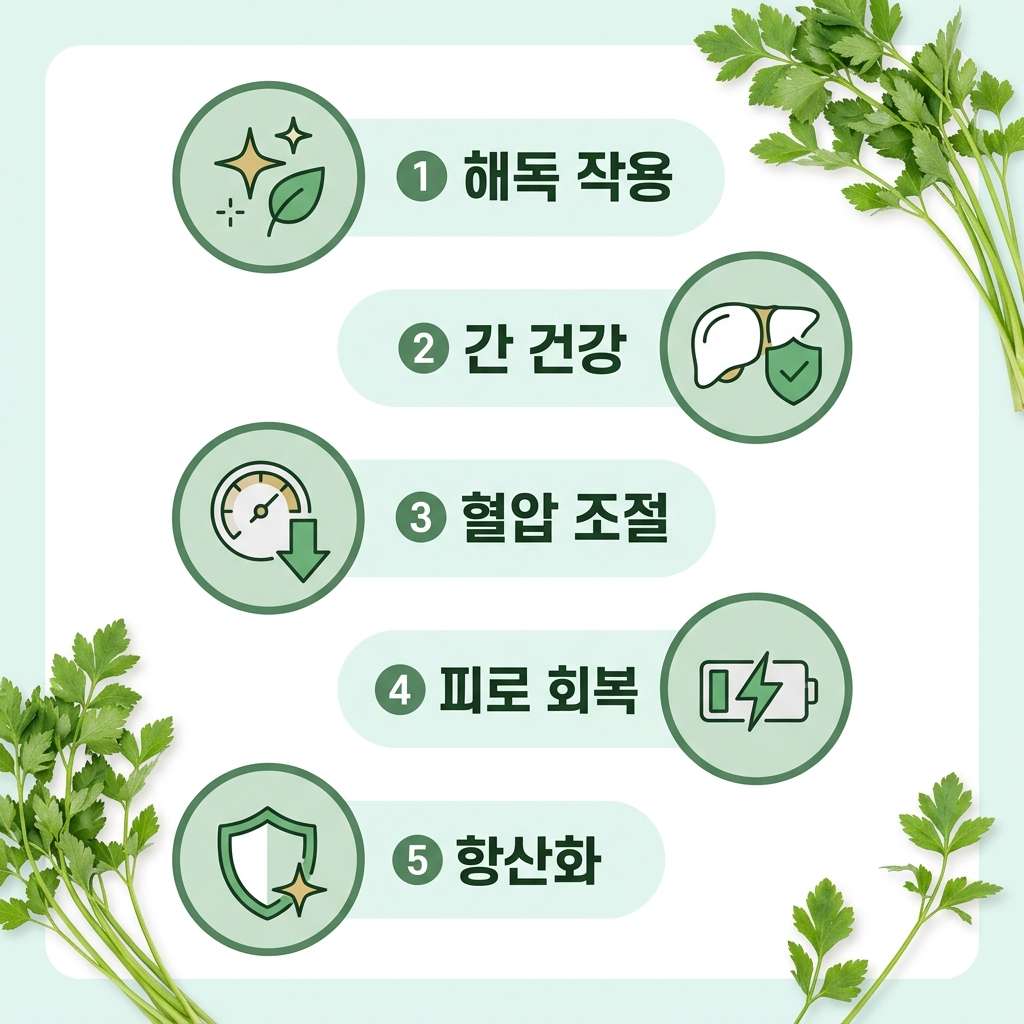 가장 먼저 손꼽히는 미나리 효능은 바로 강력한 해독 작용입니다. 미나리는 체내에 쌓인 중금속과 미세먼지를 흡착하여 배출하는 효과가 뛰어나 '천연 청소부'라고도 불립니다. 특히 복어탕에 미나리를 넣는 이유도 복어의 독을 중화시키기 위함일 정도로 독소 제거에 탁월합니다.