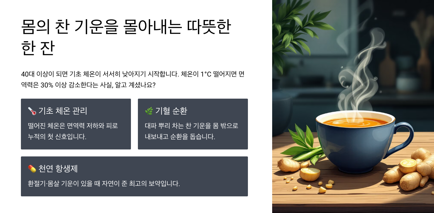 대파 뿌리의 영양을 가장 효과적으로 섭취하는 방법은 바로 따뜻한 차로 마시는 것입니다. 특히 40대 이상이 되면 기초 체온이 떨어지기 쉬운데, 대파뿌리 차는 몸의 찬 기운을 밖으로 내보내고 기혈 순환을 돕는 데 탁월한 효과가 있습니다.
