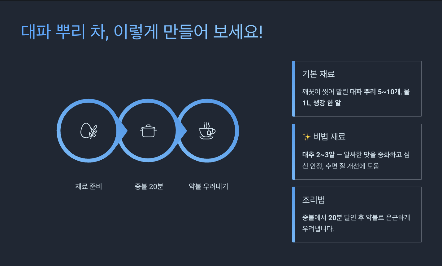 만드는 법은 간단합니다. 깨끗이 씻어 말린 대파 뿌리 5~10개와 물 1L, 그리고 생강 한 알을 넣고 중불에서 20분 정도 달여주세요. 이때 대추를 2~3알 함께 넣으면 대파의 알싸한 맛을 중화시켜 줄 뿐만 아니라, 심신 안정과 수면 질 개선에도 도움을 줄 수 있습니다.