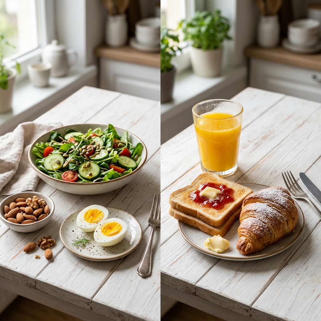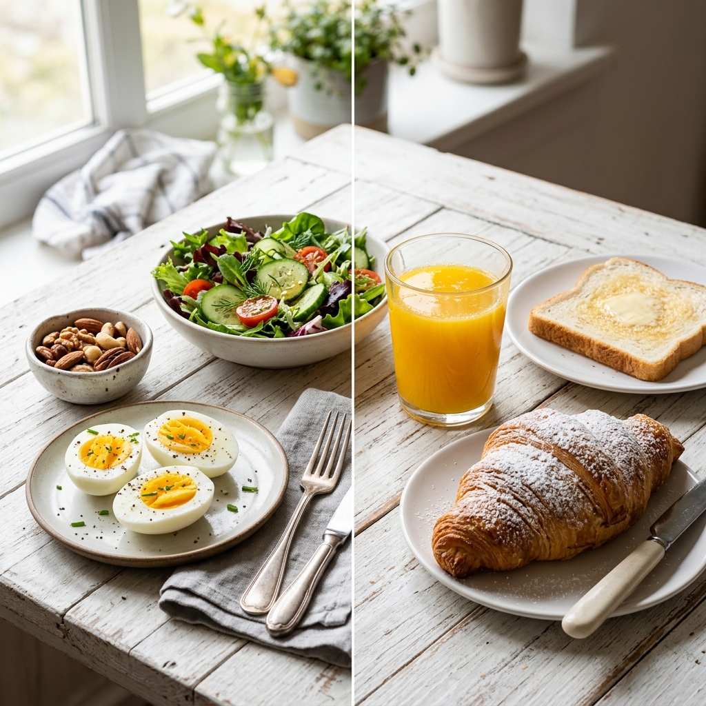 아침 공복 상태에서는 혈당이 매우 민감하게 반응합니다. 이때 무엇을 먼저 먹느냐가 하루 전체의 혈당 흐름을 결정하죠. 혈당 스파이크를 방지하기 위해 공복에 먹으면 좋은 음식은 삶은 달걀, 견과류, 채소 샐러드와 같은 단백질 및 식이섬유 위주의 식단입니다.