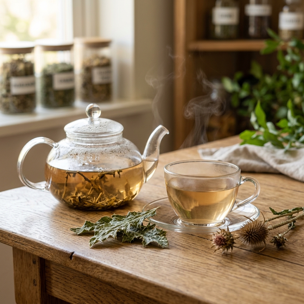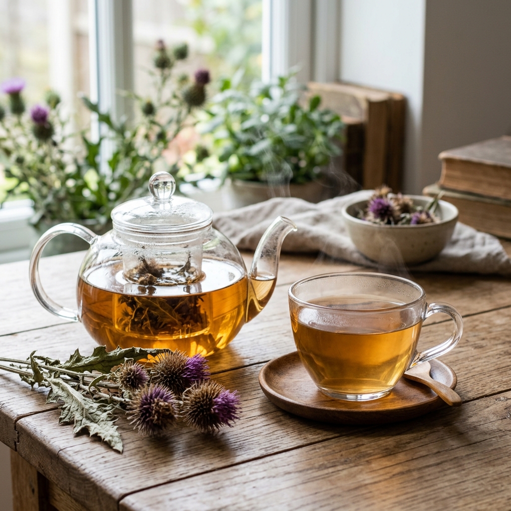 가장 편하게 즐길 수 있는 방법은 엉겅퀴 차로 마시는 것입니다. 잘 말린 엉겅퀴 10~15g을 물 2L와 함께 끓여 물이 반으로 줄어들 때까지 달여 마시면 그 풍미와 영양을 온전히 느낄 수 있습니다.